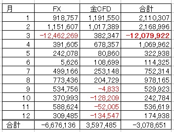 まずは差金決済取引のFXと金CFDの月次集計表を貼る。